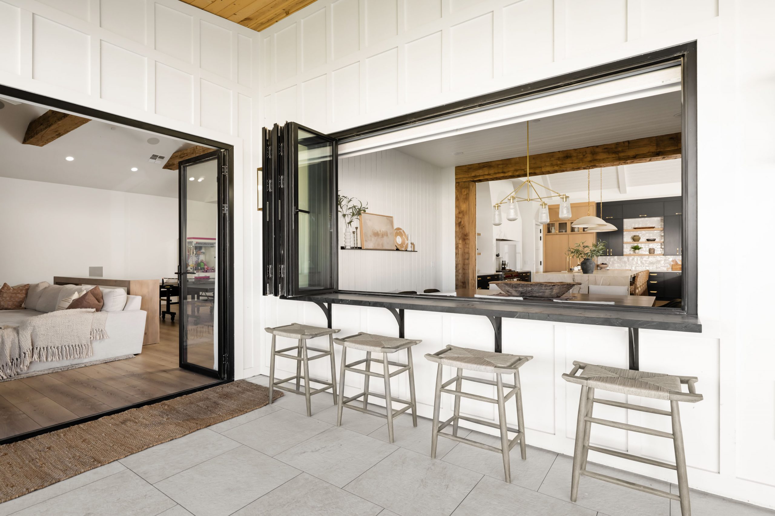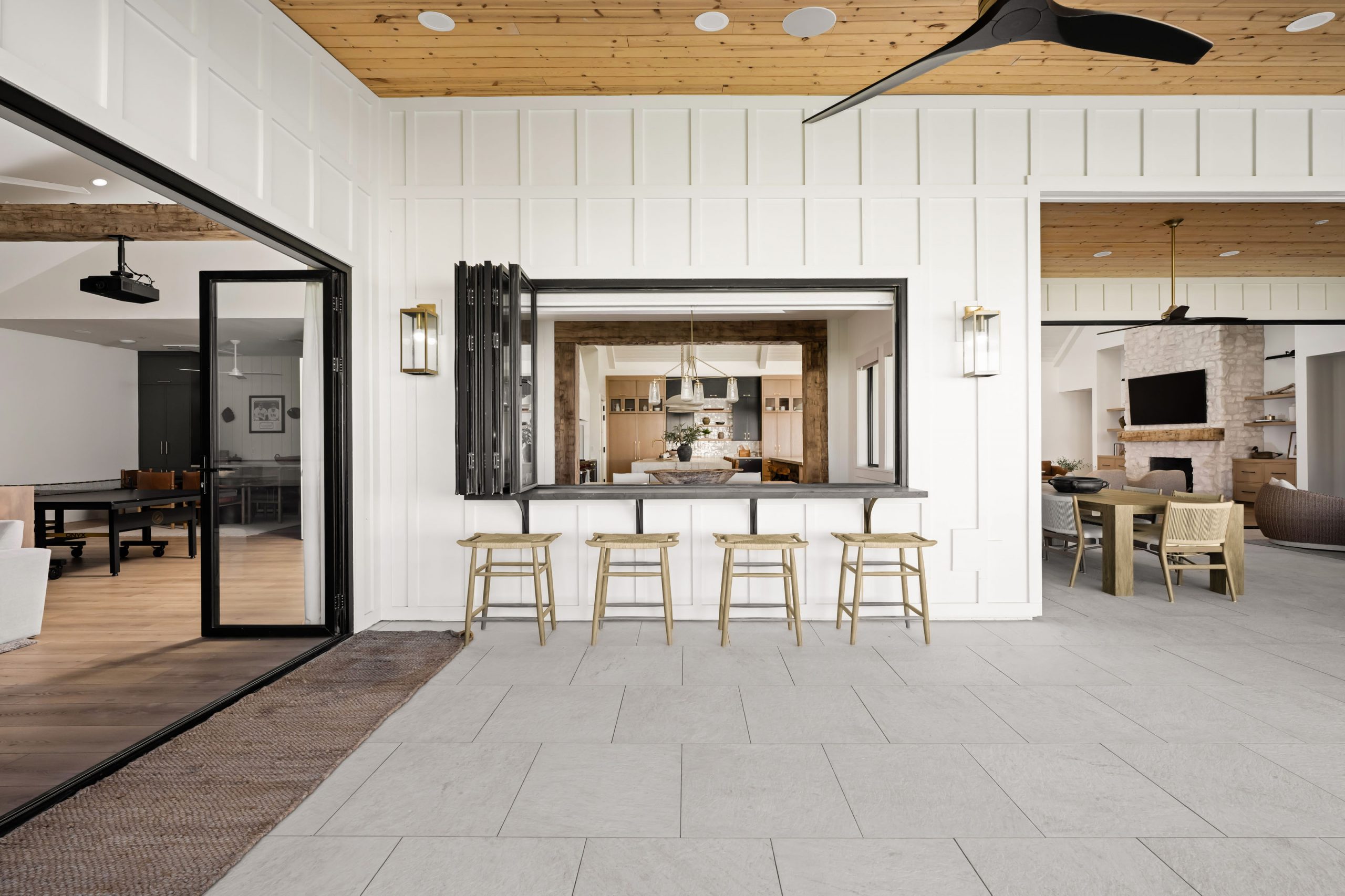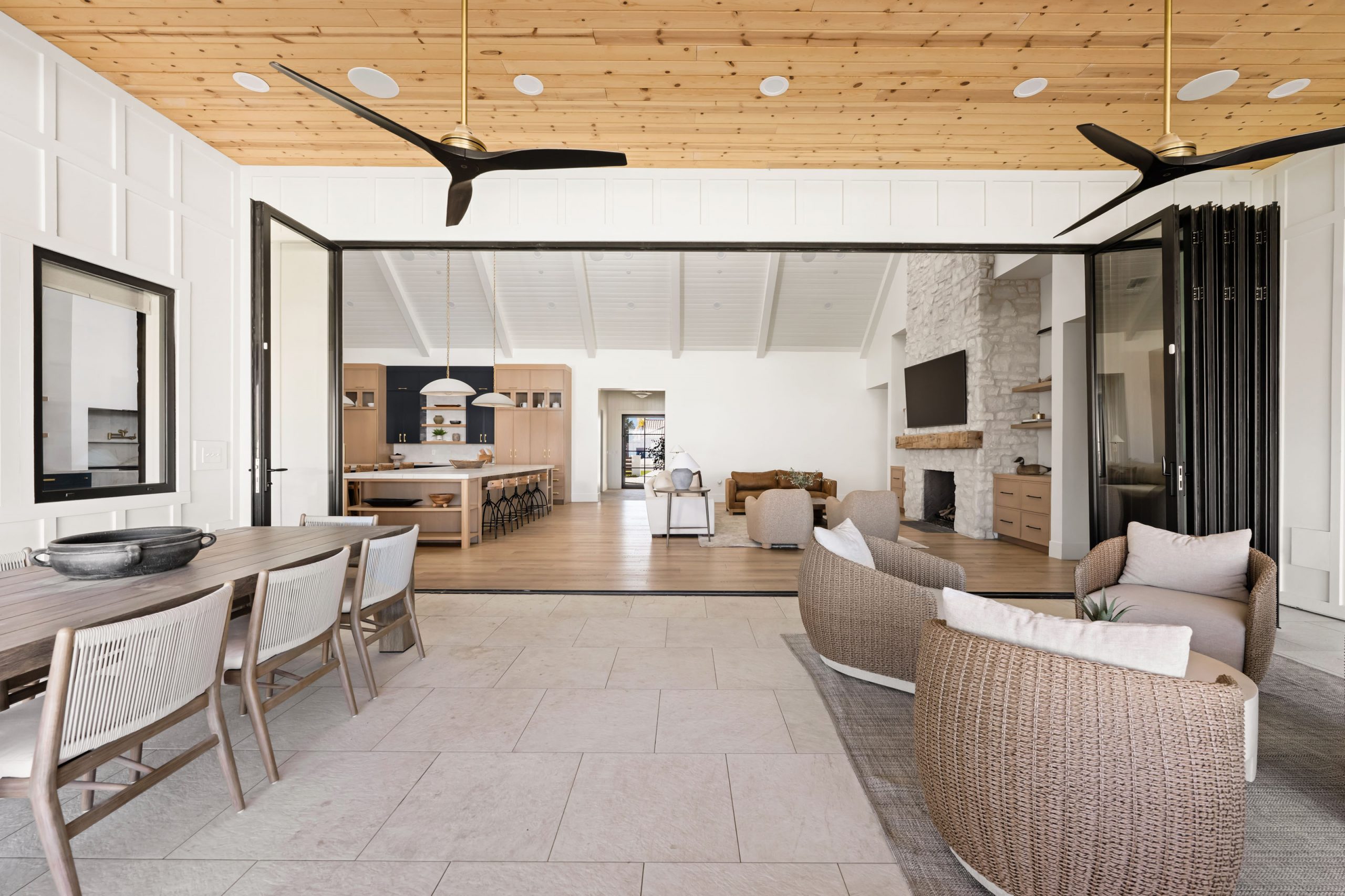 The client came to Kingdom & Co. wanting a modern traditional home with serious warmth, texture, and space for entertaining. That brief shaped every decision, from the wall and ceiling treatments to the accordion doors that open the main living spaces directly to the outdoors.