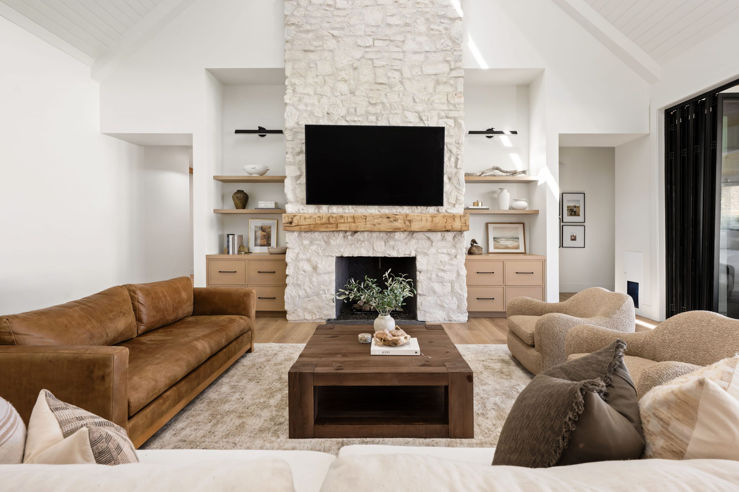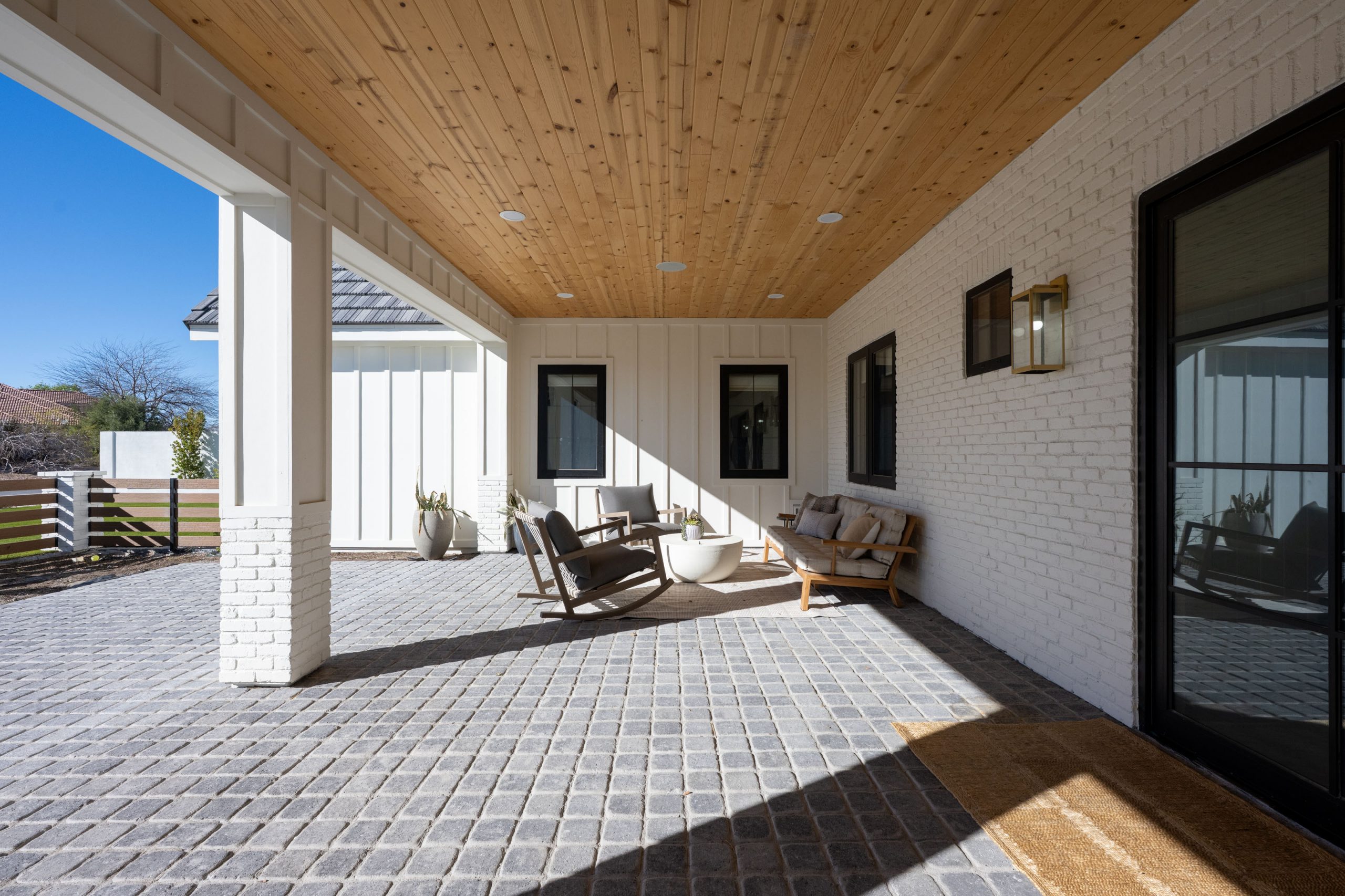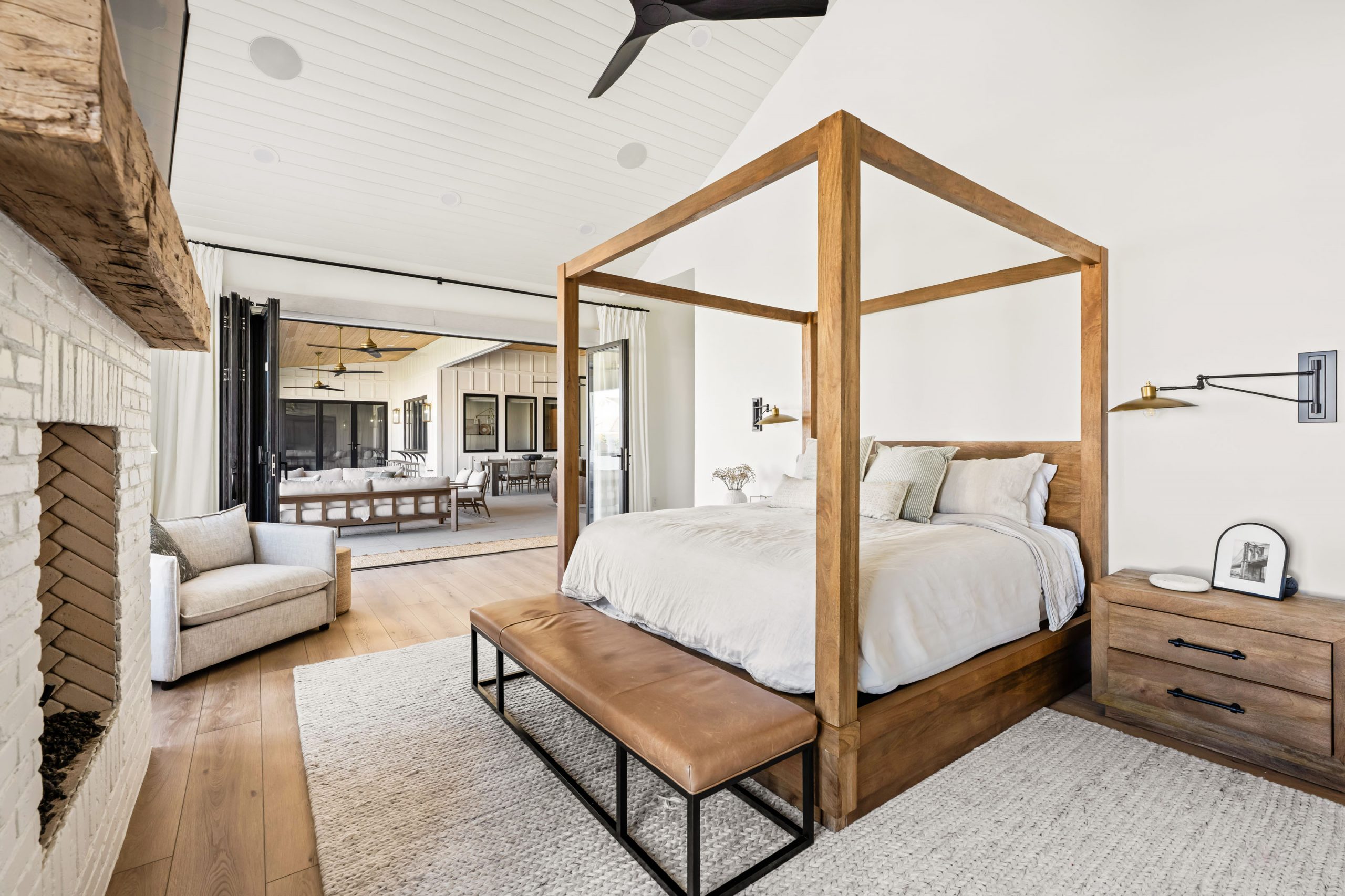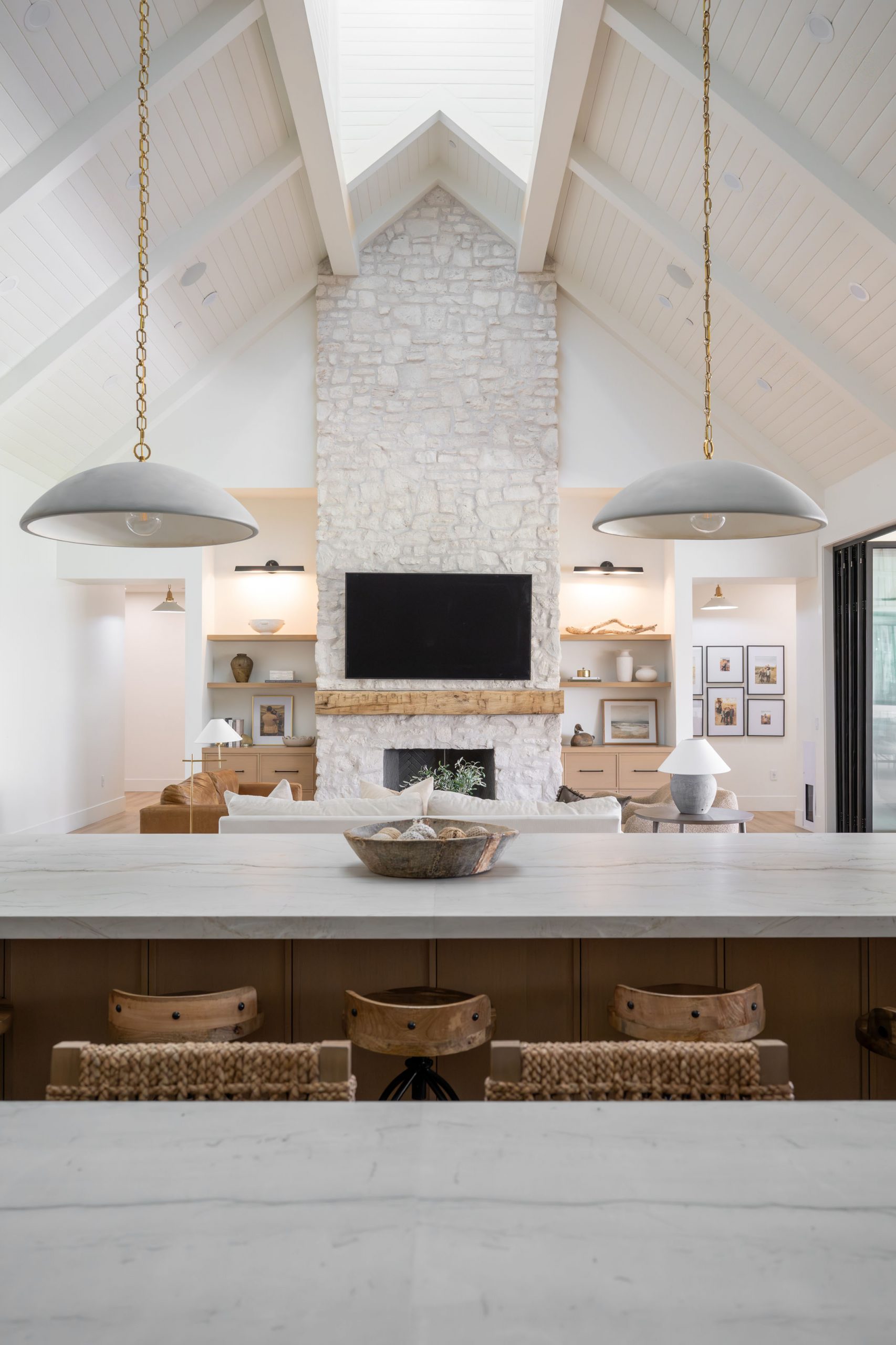 The client came to Kingdom & Co. wanting a modern traditional home with serious warmth, texture, and space for entertaining. That brief shaped every decision, from the wall and ceiling treatments to the accordion doors that open the main living spaces directly to the outdoors.