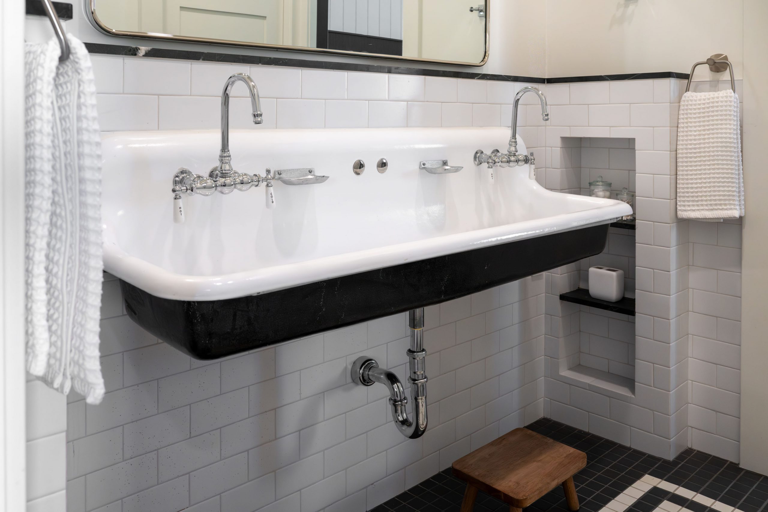 In one of the bathrooms, a repurposed sink from the client’s old high school was incorporated into the design. It is a personal detail that turns a functional fixture into a conversation piece and a connection to the homeowner’s history.