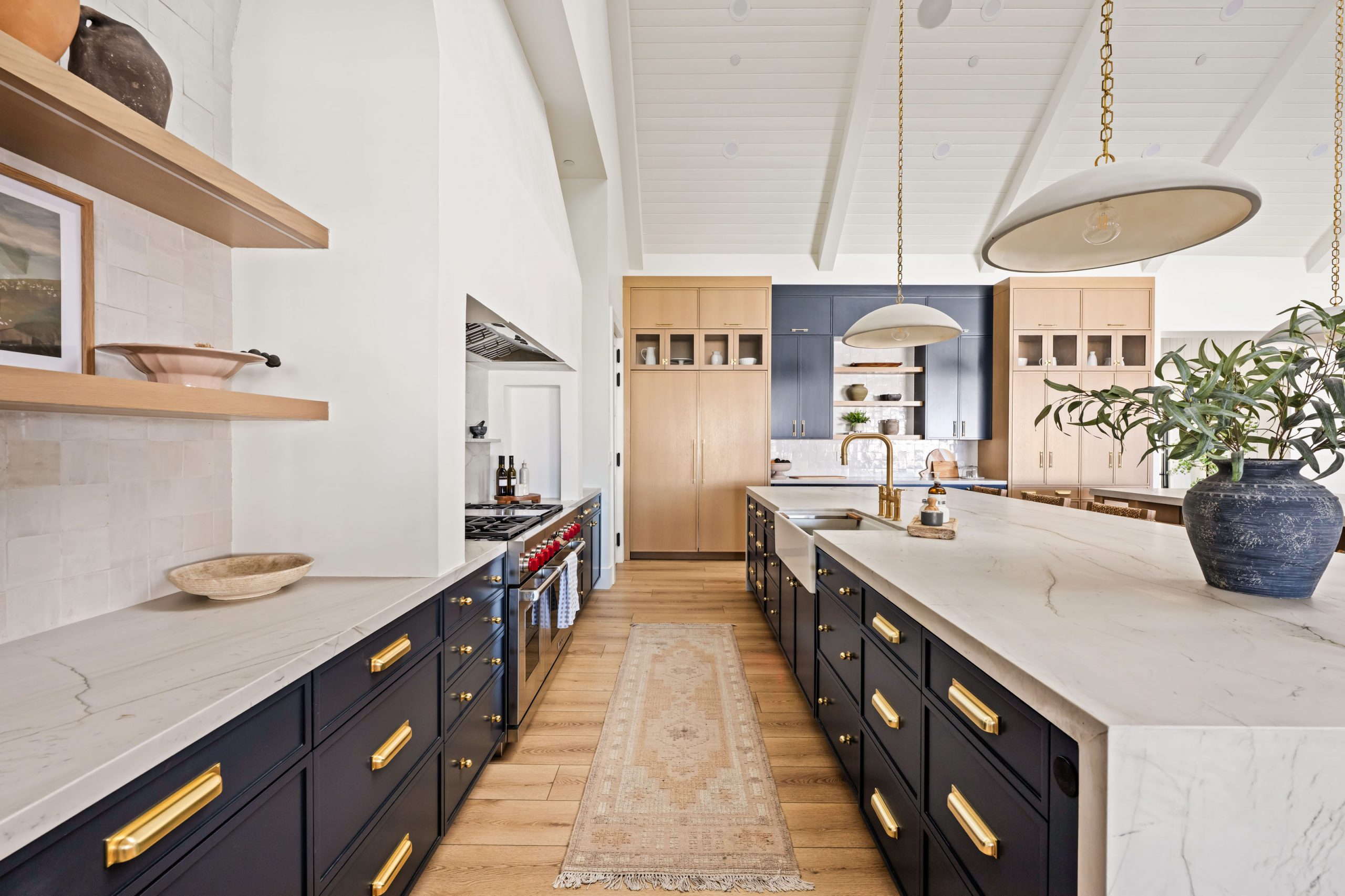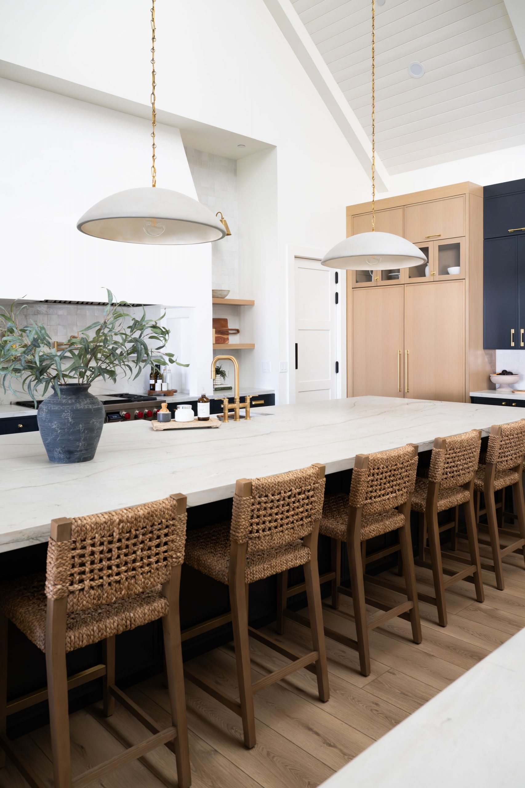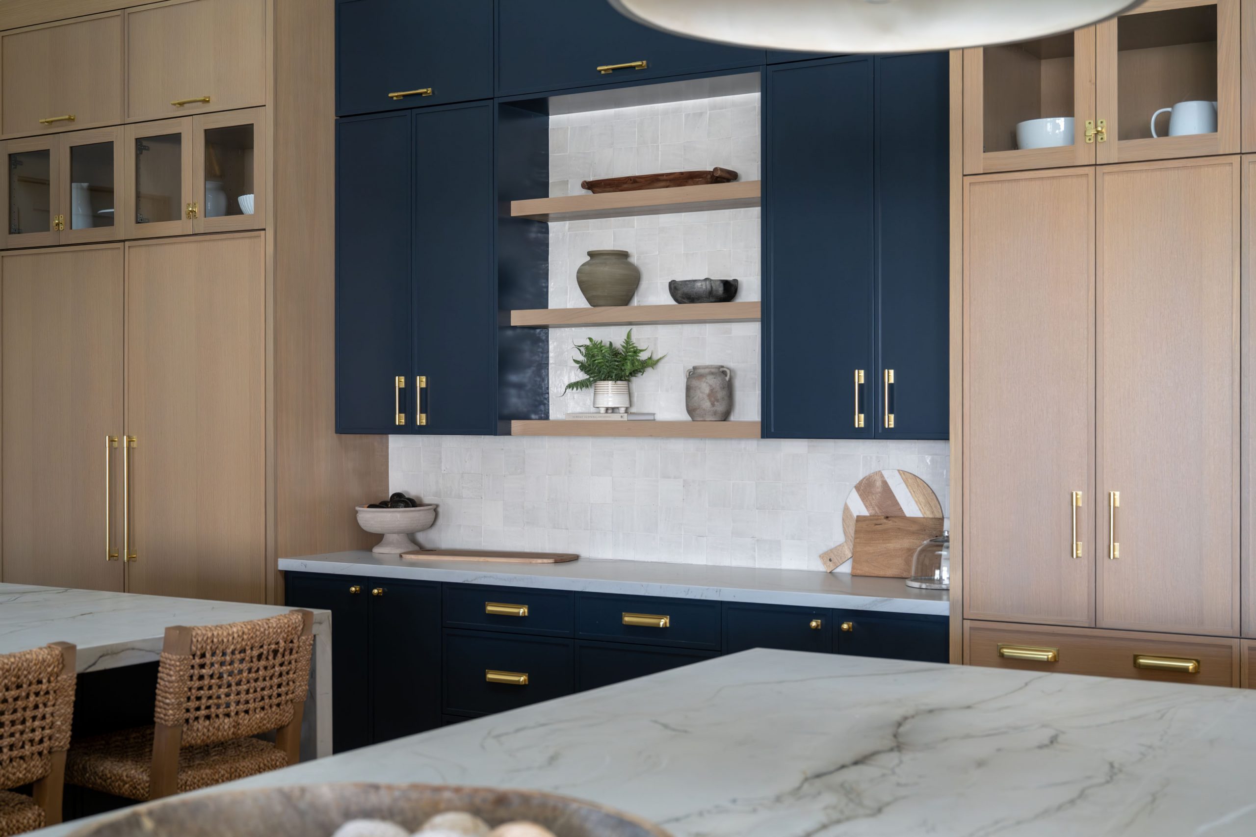 The kitchen is built around daily function and large-scale entertaining. Countertops throughout the home are leathered quartzite, chosen for both durability and texture. The client was clear from the start: no marble. Leathered quartzite delivers the visual depth of natural stone with the resilience a busy household demands. Kingdom & Co. custom cabinetry runs throughout, finished in a variety of custom wood stains and paint colors that shift from warm to cool depending on the room and its purpose.