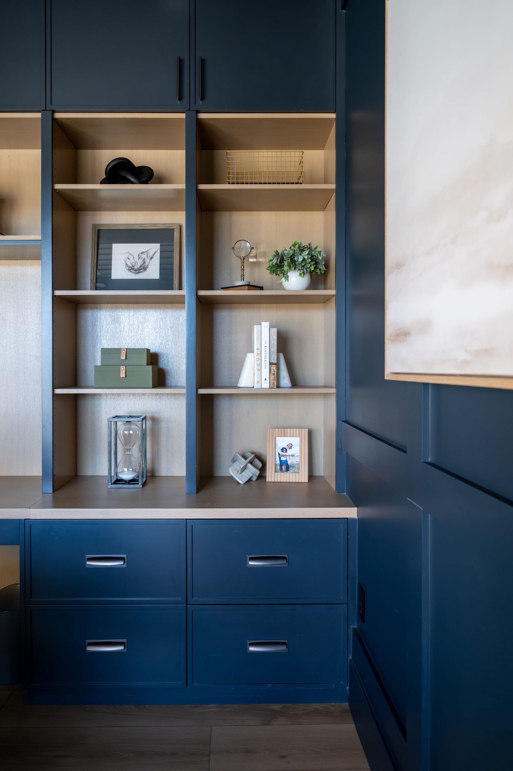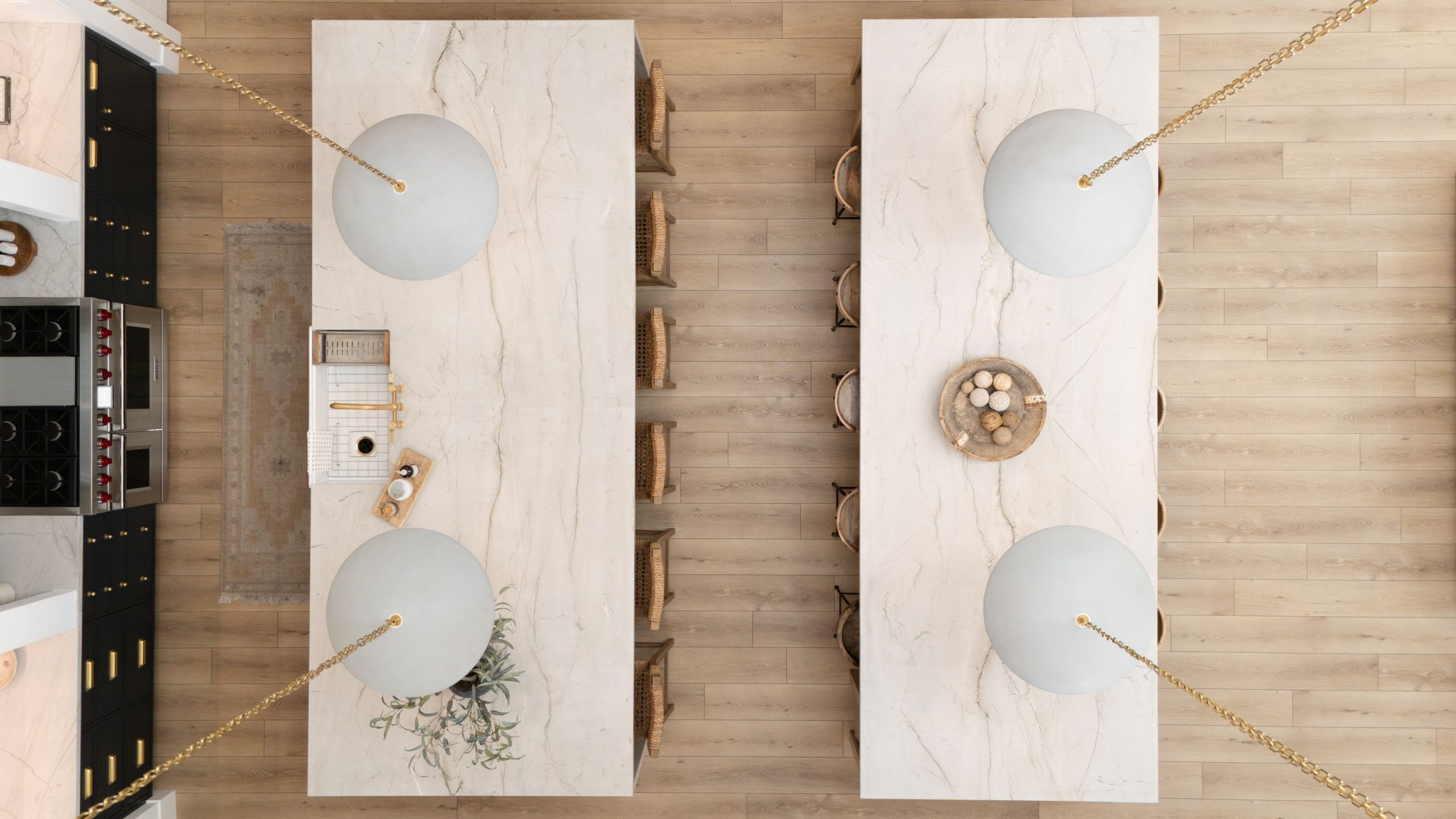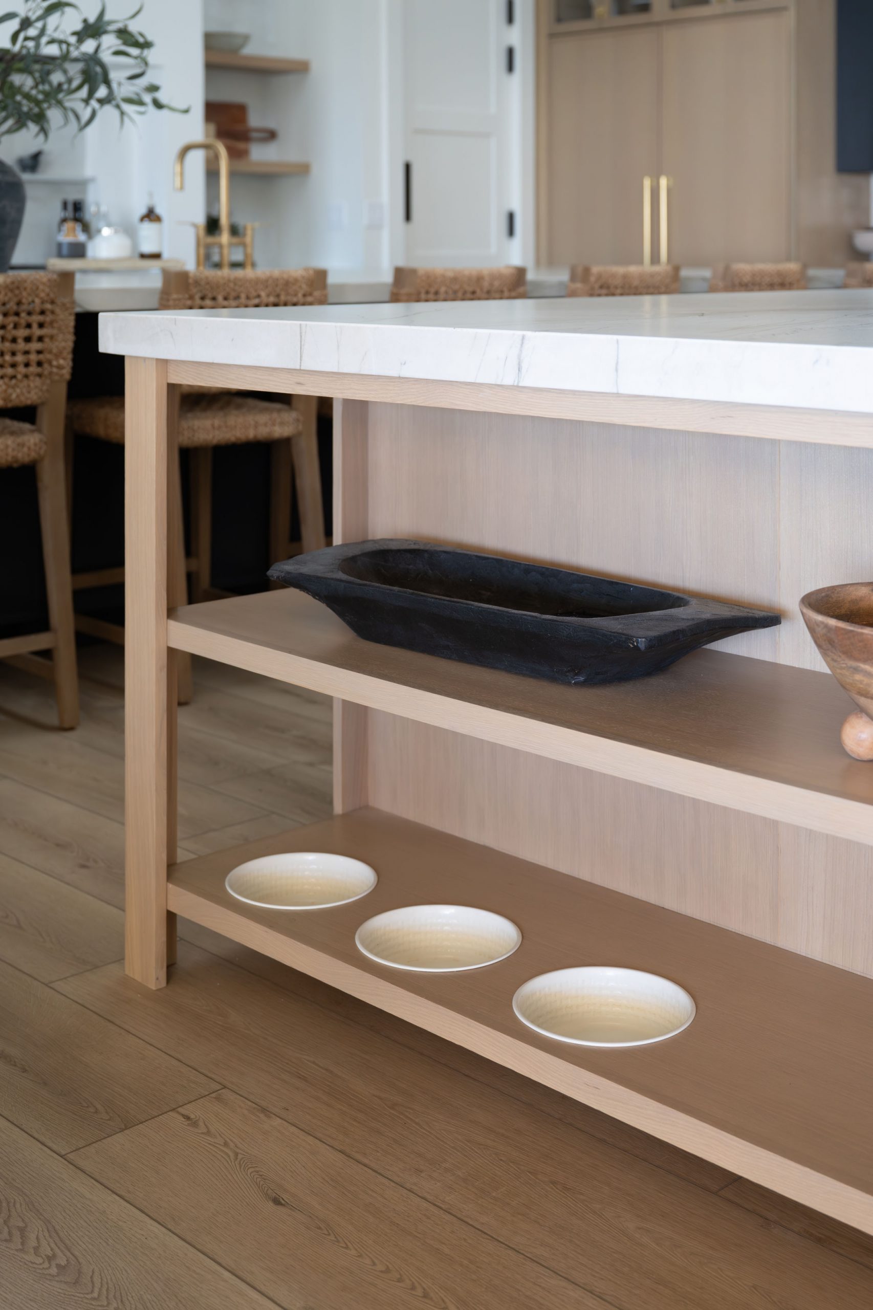 The kitchen is built around daily function and large-scale entertaining. Countertops throughout the home are leathered quartzite, chosen for both durability and texture. The client was clear from the start: no marble. Leathered quartzite delivers the visual depth of natural stone with the resilience a busy household demands. Kingdom & Co. custom cabinetry runs throughout, finished in a variety of custom wood stains and paint colors that shift from warm to cool depending on the room and its purpose.