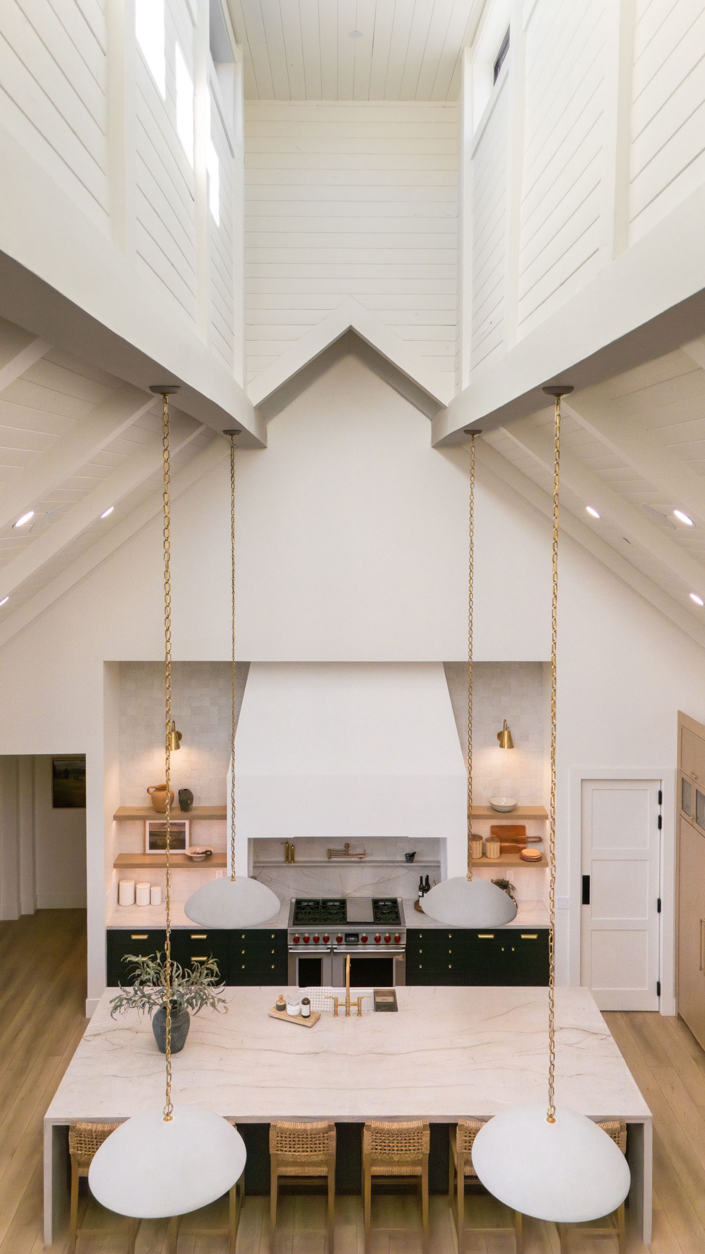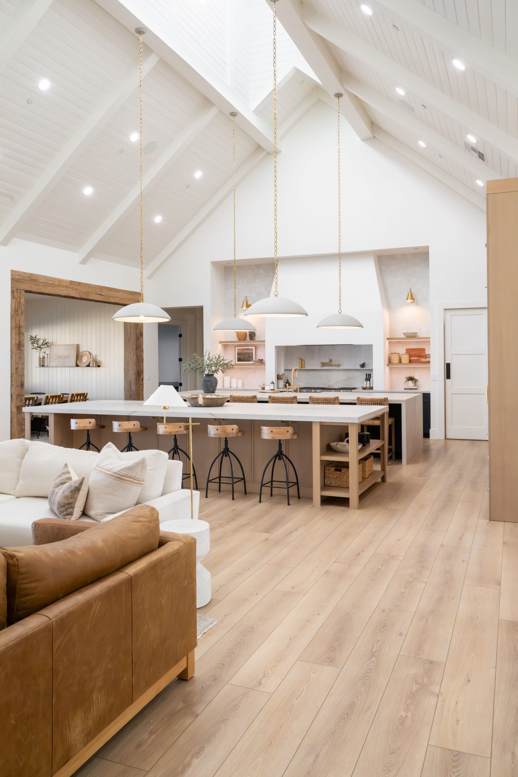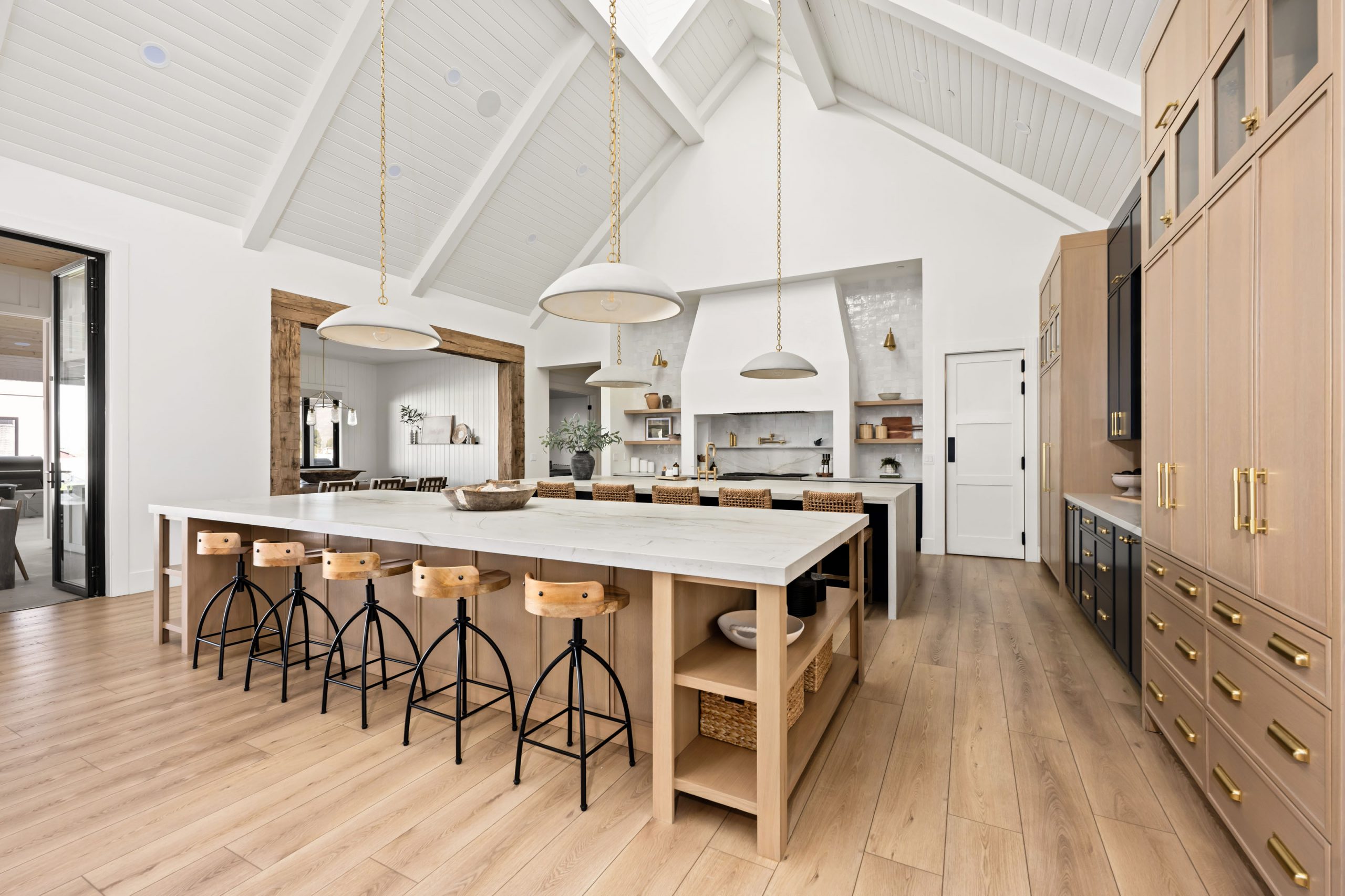 The main living room and kitchen area is the standout space in the Magnolia Heights Estate. This is where all the different materials in this custom home Las Vegas project come together in one room and work beautifully: tongue and groove, stone, reclaimed beams, custom cabinetry, and the cupola overhead. Each material was selected to complement the others, and the result is a space that feels layered and intentional rather than decorated.