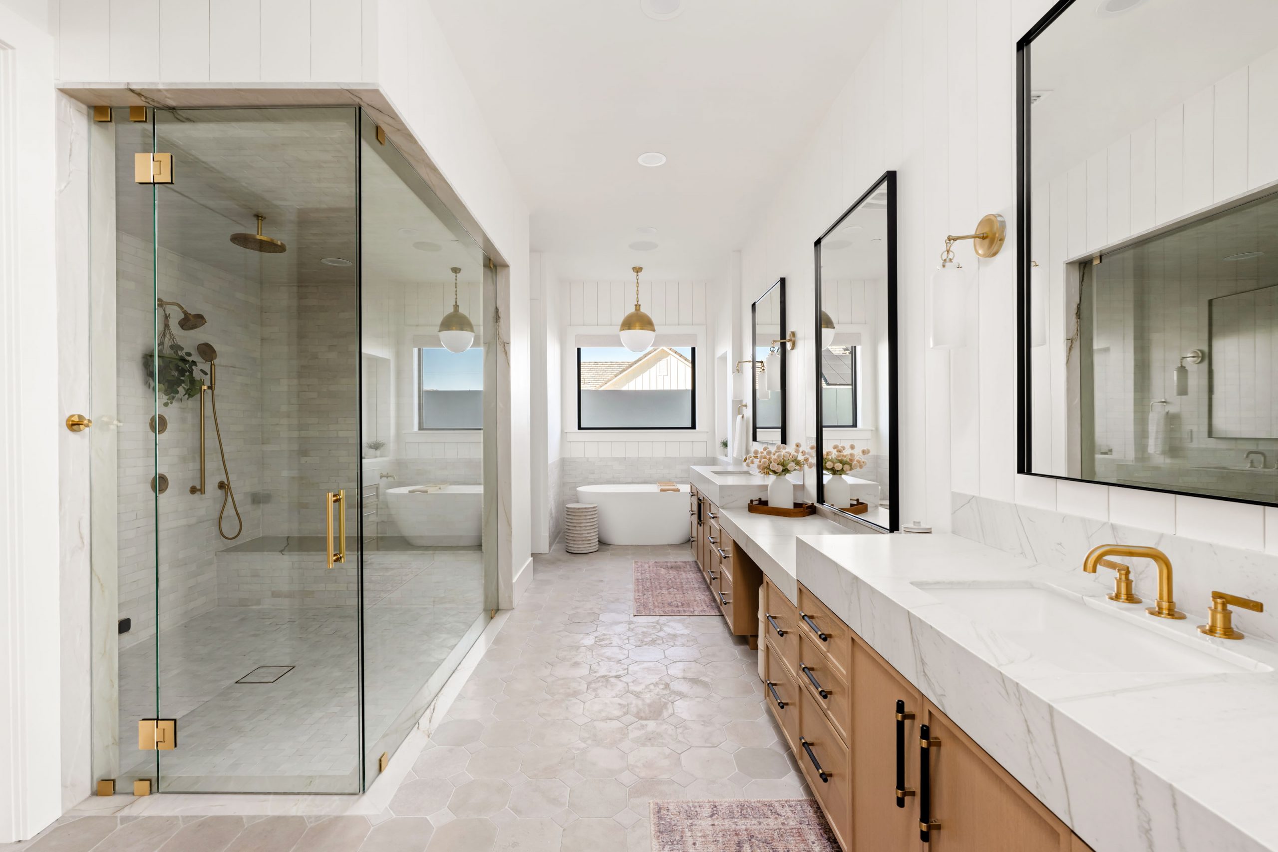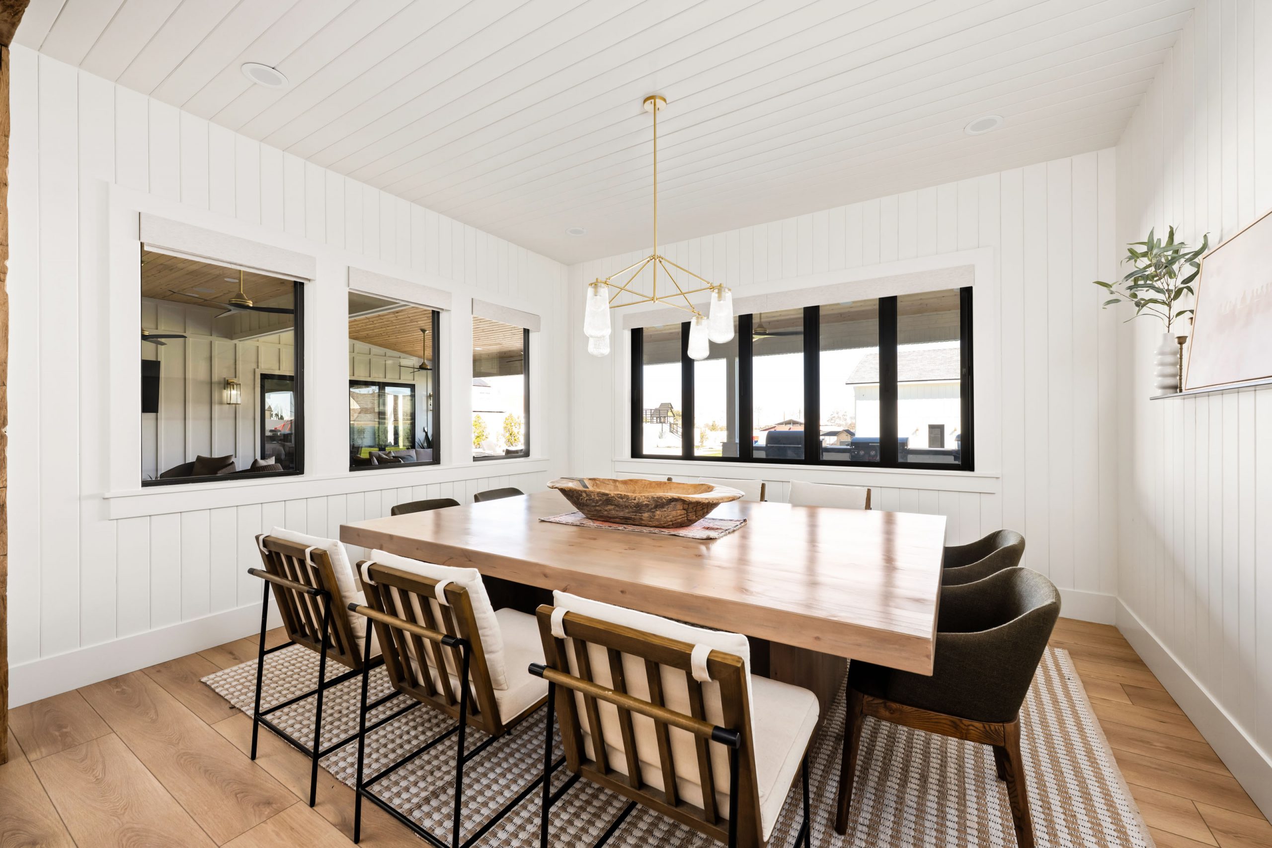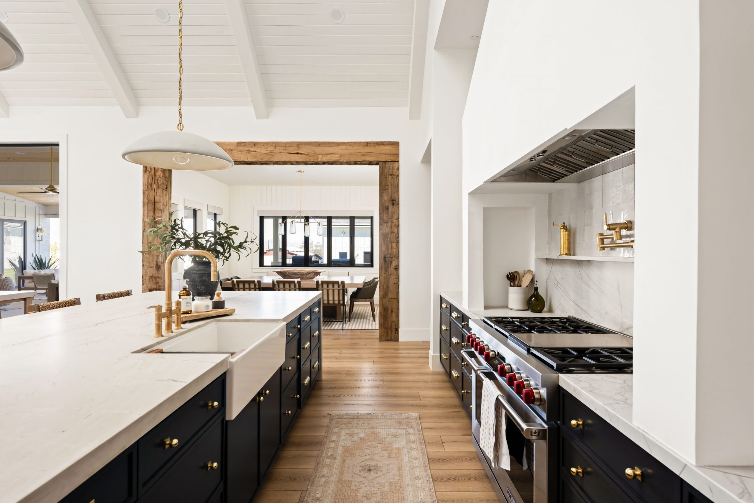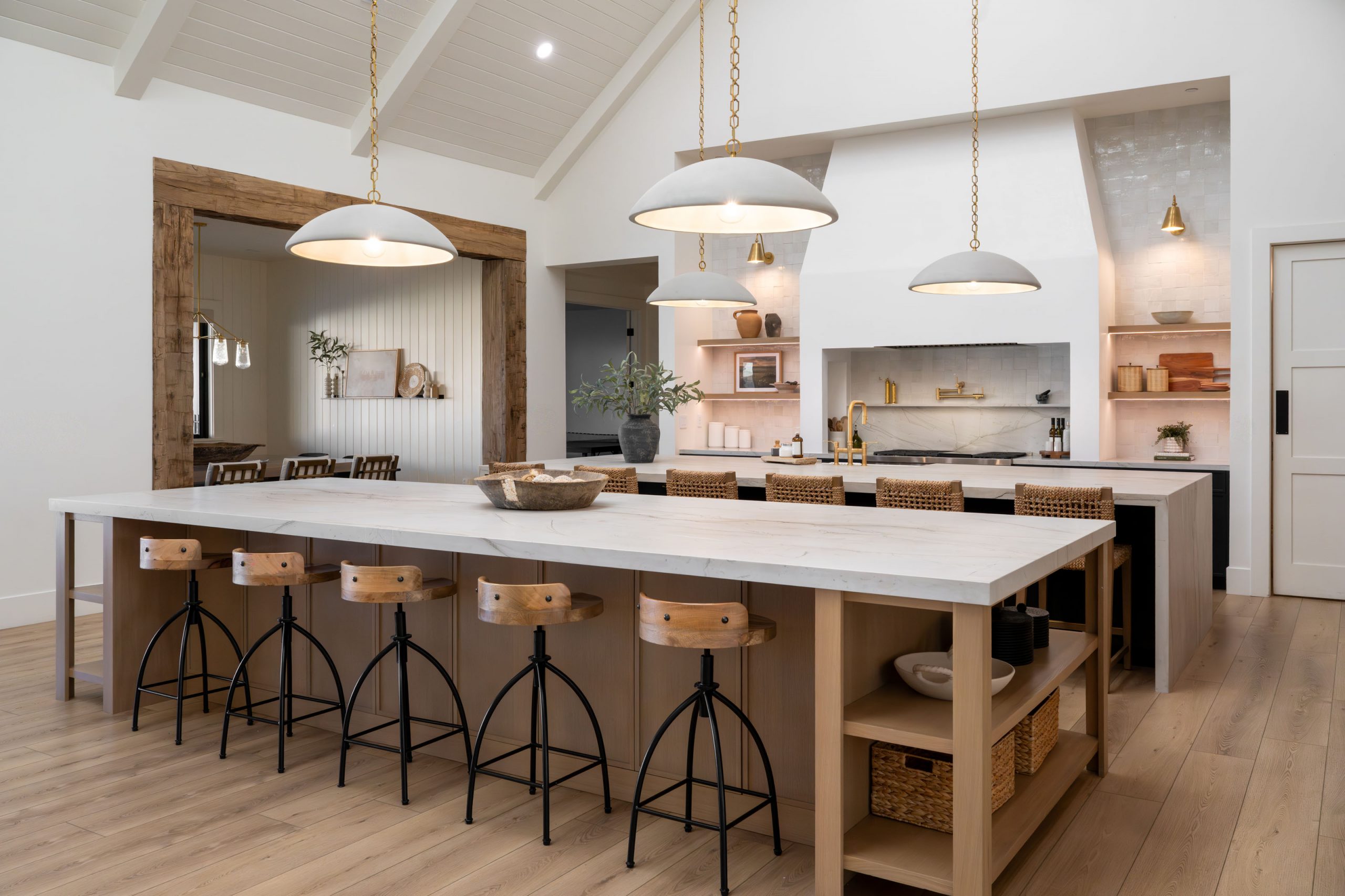 Modern traditional is a design approach that pairs timeless interior architecture — millwork, trimwork, ceiling treatments, and natural materials — with the open layouts, large glazing, and clean massing of modern construction. In the Magnolia Heights Estate, this shows up as reclaimed wood beams, tongue and groove ceilings, leathered quartzite countertops, mixed metal finishes, and accordion doors that open the main living spaces to the outdoors. The result is a home that feels warm, layered, and intentional — refined without feeling dated, modern without feeling cold.