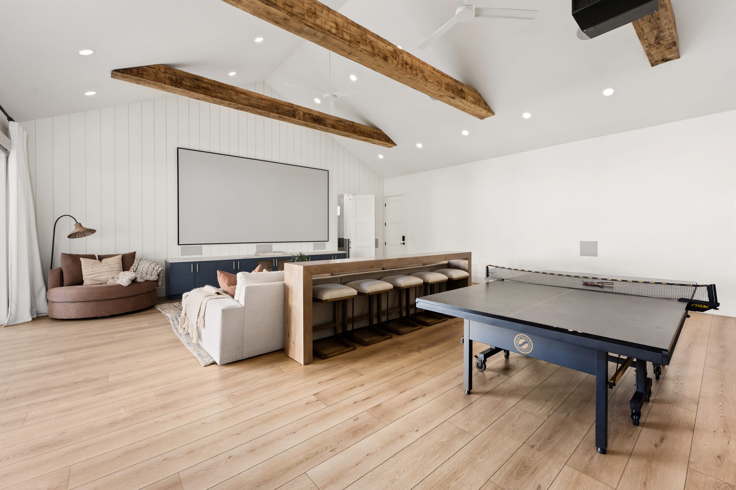 Throughout the home, real reclaimed wood beams span the ceilings. These are not faux beams. They are authentic reclaimed beams shipped from out of state because the client wanted the raw, realistic texture that only aged wood provides. Finding the right source required significant research into beam suppliers, wood species, and the structural requirements for spanning the tall ceiling heights in this home. The tongue and groove ceiling treatments that run between the beams add warmth and dimension, reinforcing the home’s traditional character without competing with the clean modern architecture. These details are what separate a custom home Las Vegas project from a production build.