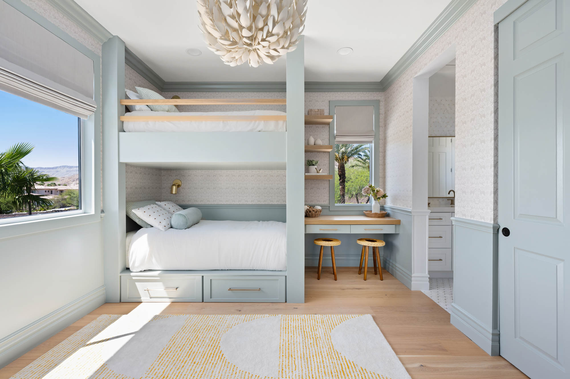 This Red Rock Country Club home underwent a complete, head-to-toe renovation with incredible attention to detail. We swapped the living and dining spaces, extended the kitchen to include a custom breakfast nook, and transformed a formal playroom into a speakeasy-style bar. The statement entryway truly sets the tone for the rest of the project.